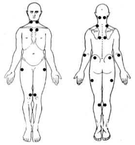 Tender points are often used to diagnose Fibromyalgia. The diagram above shows some of the typical ones although not everyone suffering from Fibromyalgia will experience all of them and there are many more such points.